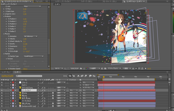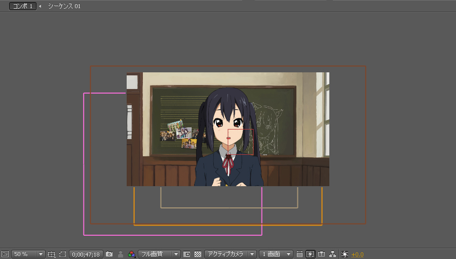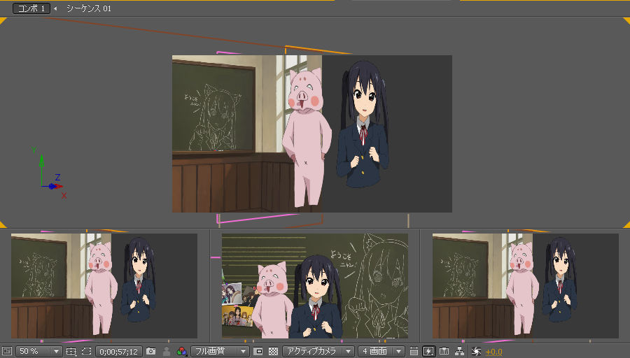 今回はカメラを使って背景とキャラ部分を分けてAE上で動かしています。