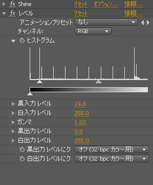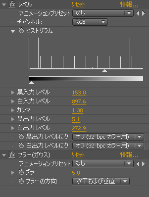 エフェクトからレベル補正とブラー(ガウス)をつけておきます。